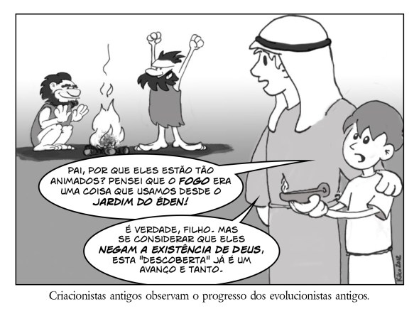 Mesmo assim, pense um pouco sobre a ideia. Imagine Adão e Eva, o auge da perfeição humana criada, saindo em desgraça do Éden, e dando de cara com um bando de homens da caverna que só recentemente tomaram o passo evolutivo que deu-os a capacidade de andar eretos, e de usar efetivamente o dedão. Posso até ver que aqueles trogloditas, acocorados em cima de um morro, mastigando sua carne crua, observando, maravilhados (e um pouco invejosos), enquanto Adão, sem mais nem menos (mas ainda com “o suor do seu rosto”), corta uma árvore, constrói um abrigo, acende uma fogueira, e passa a viver seu dia a dia fora do Jardim. Estes jovens evolucionistas teriam que ser muito teimosos para observar como Caim domesticou as plantas, ou Abel os rebanhos, ou Tubalcaim conquistou o bronze e ferro, ou Jubal aperfeiçoou instrumentos musicais, e ainda assim se recusarem a aprender estas técnicas porque não se encaixariam no seu cronograma evolutivo! Posso até imaginar os seus adolescentes reclamando: “Mas Pai, os criacionistas fazem todo esse trabalho pesado com ferramentas maneiras de metal! A gente não pode pelo menos emprestar algumas?” O pai retruca, “Fica quieto, e continue afiando essa lança com essa pedra! A gente só vai usar essas ferramentas daqui a alguns milênios! Você nem sabe como era quando eu tinha sua idade…”